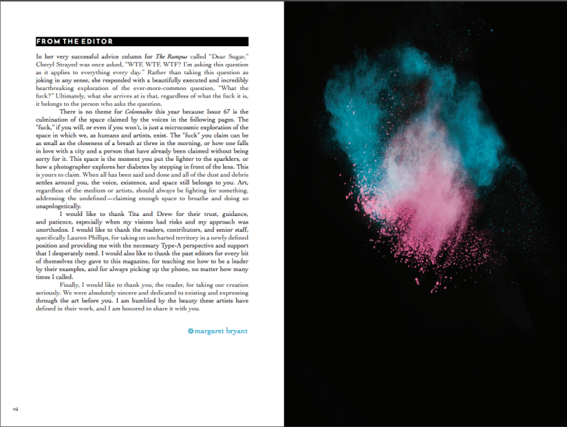 As the Editor-in-chief of Issue 67 for Colonnades Literary and Arts Magazine, I had the pleasure of creating the book featured below. Please feel free to download and read the magazine in full below.