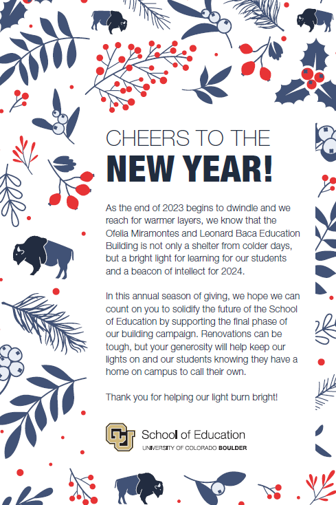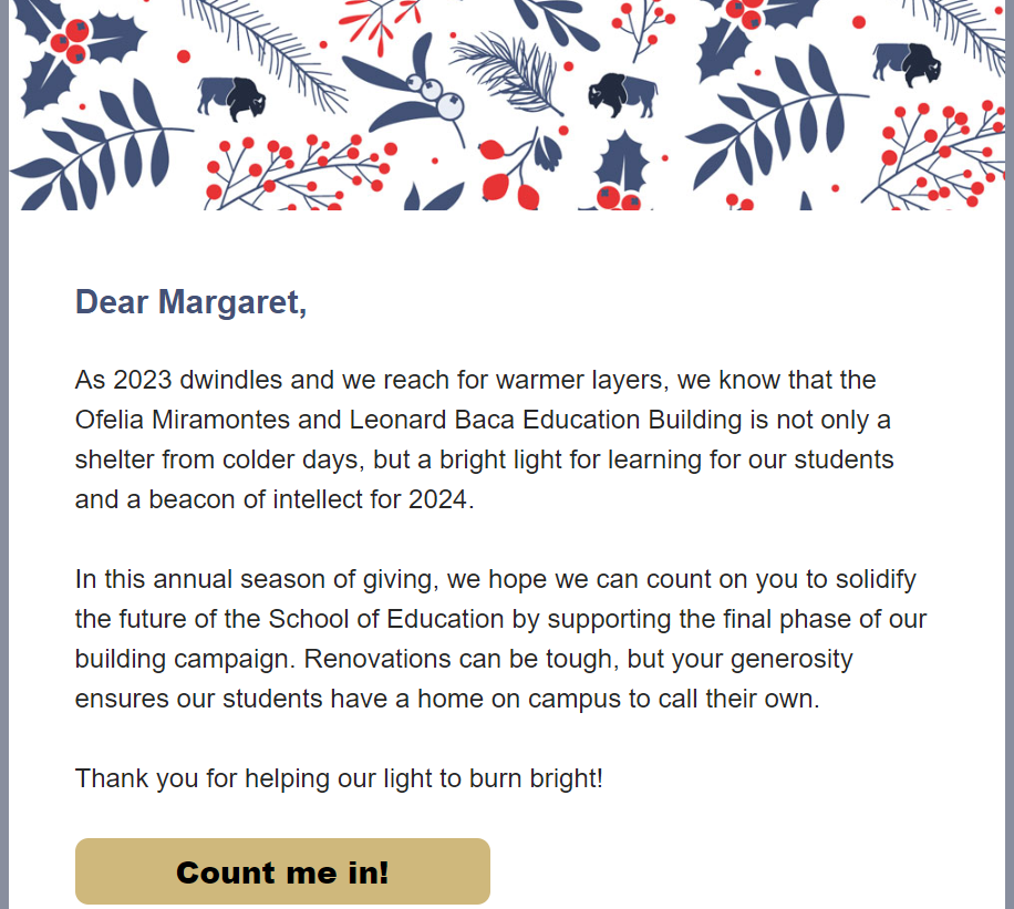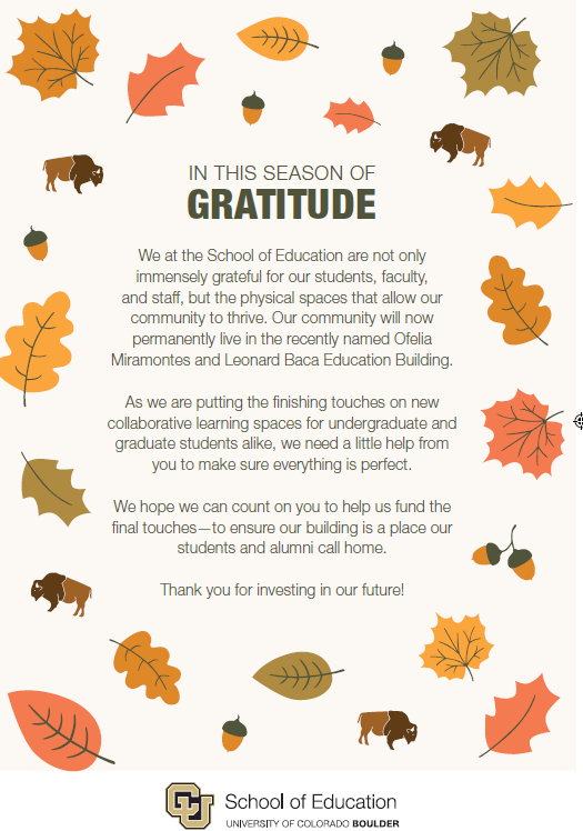 Over the last three and a half years, I have worked on the Capital Building Campaign for the School of Education’s permanent home in the newly named Ofelia Miramontes Leonard Baca Education Building. We have raised millions of dollars for this renovation to ensure that students in the School of Education have been set up for success in modular and adaptable classrooms designed for learning. I have written multiple fundraising appeals, designed printed collateral, and collaboratively produced fundraising videos designed to garner support from our community.